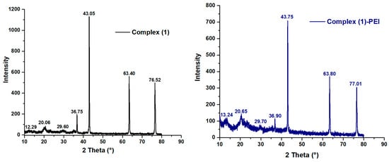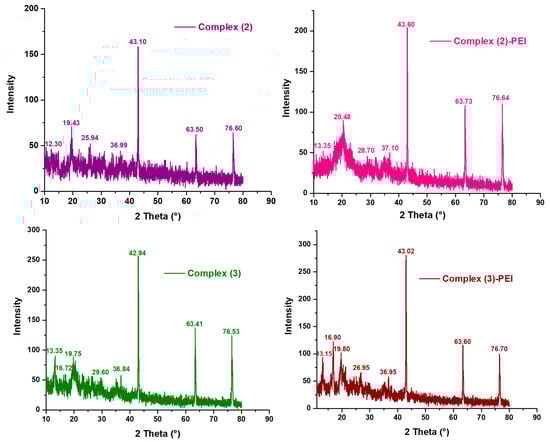 Figure 3 shows the XRD patterns of complex (1–3) and modified complexes. As shown, the complex 1 reveals sharp peaks observed at 2θ = 12.29°, 20.05°, 26.60°, 36.75°, 43.05°, 63.40°, and 76.52°. However, the complex 2 exhibits a series of peaks observed at 2θ = 12.30°, 19.43°, 25.94°, 36.99°, 43.10°, 63.50°, and 76.60°. The complex 3 displays a series of peaks observed at 2θ = 13.35°, 16.72°, 19.75°, 29.60°, 36.84°, 42.94°, 63.41°, and 76.53°. These peaks point to the crystalline character of the porphyrinic complexes [40,41]. In addition, we find a slight displacement of the position of the principal peaks for the modified complexes (1–3) compared to the unmodified ones. This shifting suggests again the chemical interaction between the complexes (1–3) and polyethyleneimine.