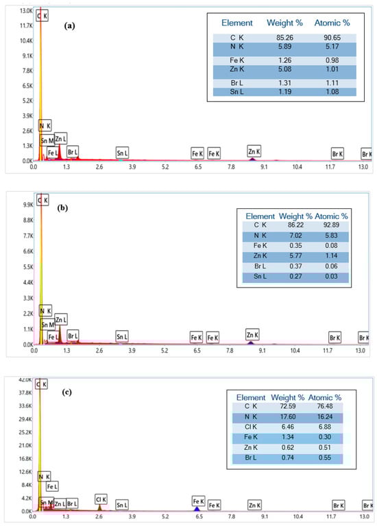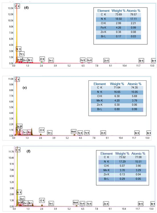 The EDX data support the complexation of zinc, iron, and manganese metals with the porphyrinic core (Figure 5). As expected, an increase in carbon and nitrogen contents after the addition of PEI polymer to the complexes (1–3) is visible. This confirms the interaction between the porphyrinic complexes and polyethyleneimine.