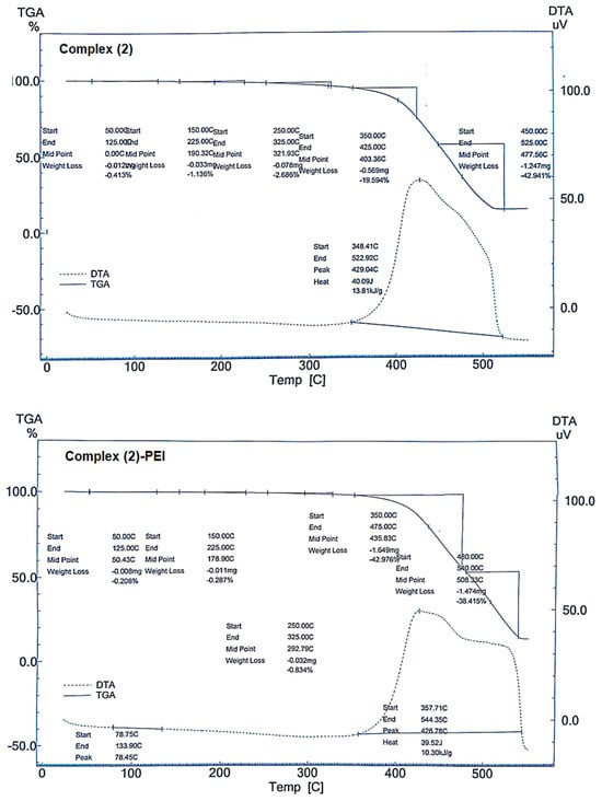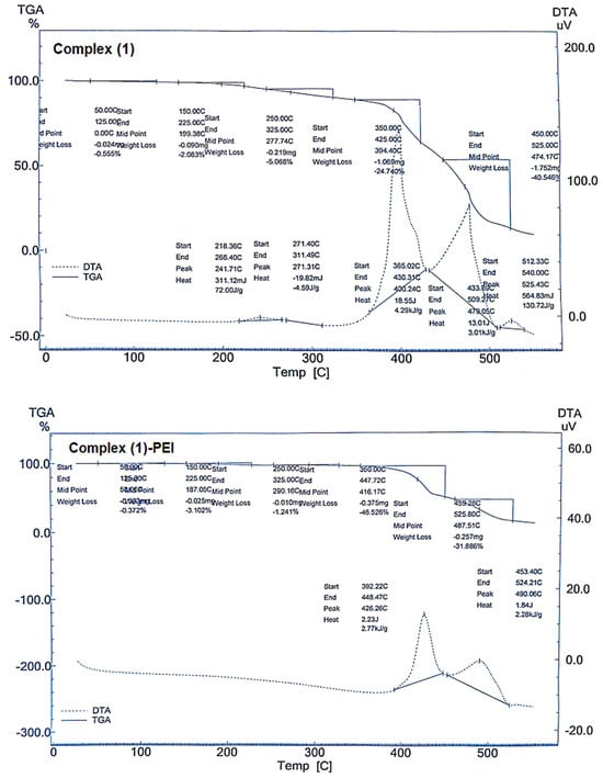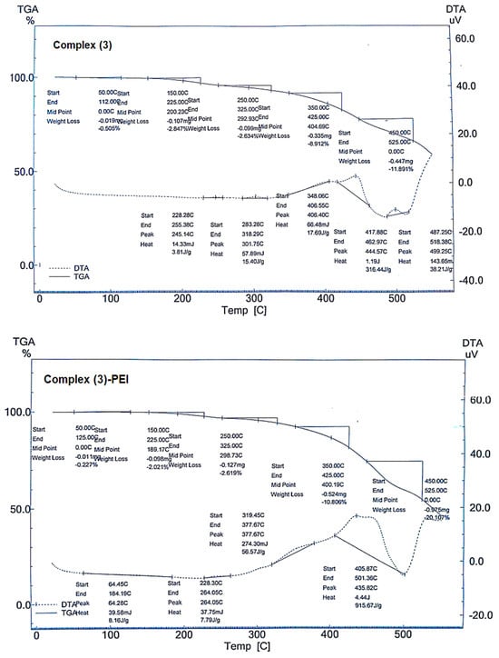 The thermal analysis of complexes (1–3) and modified complexes is shown in Figure 6. All the obtained complexes show thermal processes at temperatures below 100 °C, indicating the release of adsorbed water [44]. The total mass reduction is 72.97%, 66.77%, and 26.78% for complexes 1, 2, and 3, respectively. For the modified complexes, five occurrences are noticed in the range [50–450 °C], with total mass loss of 83.12% (complex 1-PEI), 81.88% (complex 2-PEI), and 35.78% (complex 3-PEI). The increase in the mass loss for the modified complexes confirms the chemical interaction of the porphyrinic complexes modified with polyethyleneimine. This trend also justifies the existence and degradation of the polymeric material. The thermal events indicate that the non-modified compounds are more thermostable than the functionalized ones.
