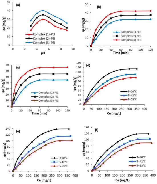 Influence of some experimental conditions on the adsorption of Naphthol blue black B using complex (1)-PEI, complex (2)-PEI, and complex (3)-PEI: (a) pH (C0 = 50 mg/L, T = 19 °C, time = 100 min), (b,c) time (C0 = 50 mg/L, C0 = 100 mg/L, pH = 5, T = 19 °C), and (d–f) temperature (data is replicated 3 times).