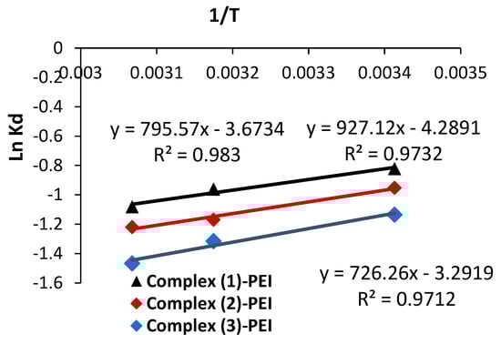 Plots of Ln Kd versus 1/T for Naphthol blue black B adsorption utilizing complexes (1)-PEI, (2)-PEI, and (3)-PEI (results replicated three times).