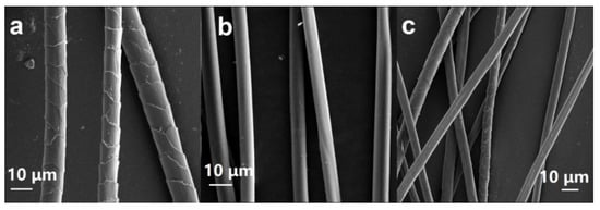 Using SEM, the micro-morphology of the samples was observed. As shown in Figure 1, the micro-morphology of AF and cashmere fibers differed significantly. The surface of AF was relatively smooth, and there were some grooves. The cashmere fibers had evenly distributed scales on the surface, which is the typical morphology of animal fibers. In C50A50, the two different micro-morphologies of fibers distribute equally, indicating that the cashmere and AFs were well mixed.