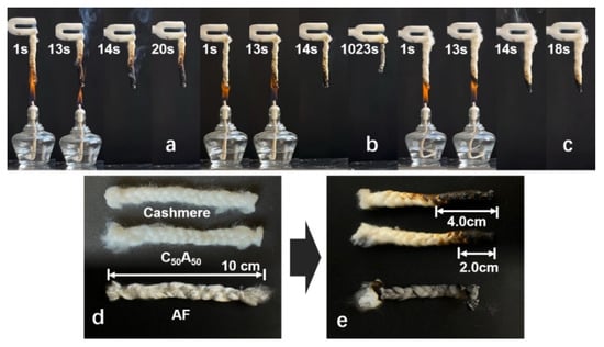 Combustion of samples in the air. (a) Cashmere, (b) AF, (c) C50A50, (d) samples before combustion, and (e) samples after combustion.