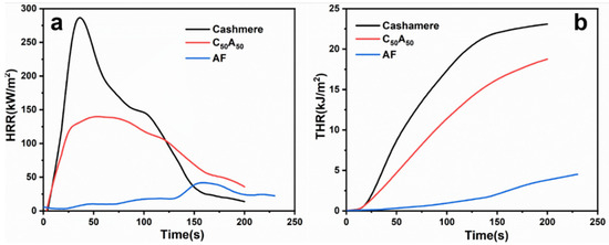 The flame-retardant properties of samples were evaluated by cone calorimeter tests, as illustrated in Figure 3 and Table 2. The time to ignition (TTI) of cashmere was about 8 s, followed by rapid combustion and significant heat release. It indicated that the combustion process of cashmere is more dramatic and poses a dangerous fire hazard, even though it could self-extinguish. In contrast, AF was difficult to ignite and exhibited a lower peak heat release rate (pHRR), total heat release (THR), and total smoke production (TSP). Although C50A50’s TTI was not significantly improved compared to cashmere, its pHRR, THR, and TSP were lower than those of cashmere samples. Besides that, the effective heat of combustion (EHC) of C50A50 was lower than that of cashmere, suggesting reduced combustion and heat generation from cashmere volatile pyrolysis products. Further, the fire growth rate (FIGRA) [] of cashmere decreased from 9.2 to 5.4 after blending, demonstrating that adding AF reduced the fire hazard of cashmere.
