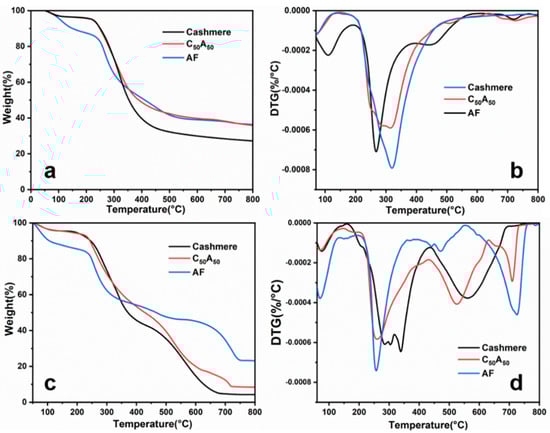 As shown in Figure 4c,d, in air, AF exhibited a similar weight loss behavior as in N2, but the reaction of oxygen with the carbon layer generates heat that accelerates CaCO3 decomposition, resulting in a significant weight loss in the fourth stage. There was no noticeable weight loss after 760 °C. In contrast to the decomposition process in N2, cashmere in air showed a third stage of weight loss (450–700 °C) with a dramatic decrease in residues. It was attributed to the reaction between oxygen and protein intermediates, leading to further decomposition of the cashmere []. The first two decomposition stages of C50A50 in air were similar to that of AF, whereas the decomposition stages after 430 °C corresponded to the third stage of weight loss of cashmere and the fourth stage of decomposition of AF, respectively, with a higher amount of residue than that of cashmere. Unlike cashmere and AF, the last two decomposition stages of C50A50 showed decreased ending temperature, caused by the fact that Ca2+ promoted the reaction between proteolytic intermediates and oxygen []. At the same time, CaCO3 absorbed the heat released by the reaction and decomposed more rapidly into CaO [].