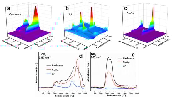 We investigated the gas-phase products of thermal degradation of cashmere, AF, and C50A50 by TG-FTIR, as shown in Figure 5. The results showed that the vibrational absorption peaks of NH3 (966 cm−1) existed in the gas-phase products of both cashmere and C50A50 and appeared at similar temperatures, indicating that the AF did not change the initial decomposition of proteins in cashmere [,]. However, comparing the position of the CO2 absorption peak (2357 cm−1) in AF and C50A50 indicates that CaCO3 in the composite fiber completes its decomposition faster, attributed to the heat released from the protein intermediates’ decomposition accelerating the decomposition of CaCO3 into CaO.