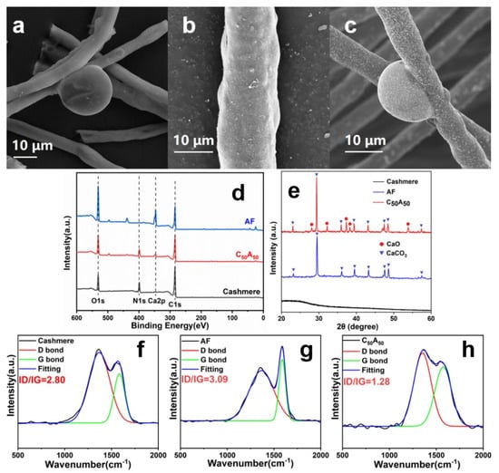 SEM images of (a) cashmere, (b) AF, (c) C50A50, (d) XPS for the residues, (e) XRD for the residues, and (f–h) RS for the residues.