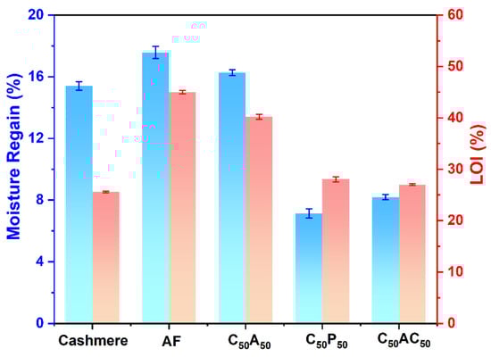 Hygroscopicity is an essential factor in determining the comfort level of fibers [,]. The moisture regain was used to characterize the hygroscopicity of the samples, as shown in Figure 7. It revealed that benefiting from a large number of hydrophilic groups on the surface, both cashmere and AF showed very high moisture regain of 15.40% and 17.57%, respectively, which is one of the most important reasons for the comfort of both fibers. However, when blended cashmere with flame-retardant polyester or flame-retardant acrylic, the flame-retardant properties of the blended fibers increased slightly, but the moisture regain decreased significantly, greatly affecting the comfort. On the contrary, even with an LOI of about 40%, C50A50 still showed a moisture regain of 16.26%, which provided both safety and a better body feeling.