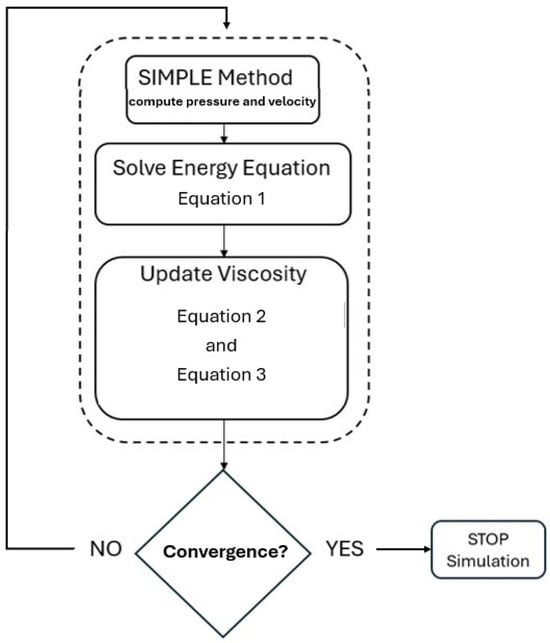 The flowchart illustrates the three main steps of the calculation procedure within the developed numerical model. First, the SIMPLE method computes the pressure and velocity fields, followed by solving the energy equation (Equation (1)), which considers viscous dissipation. The resulting temperature field is then used to update the fluid’s viscosity using Equations (2) and (3), through a two-part model: an Arrhenius-type temperature shift factor and a shear-rate dependent formulation. These updated viscosity values are fed back into the momentum and energy equations, creating a fully coupled loop. The iteration continues until convergence criteria are met, based on the stabilization of the objective function described in Section 2.3. If convergence is reached, the simulation stops; if not, the loop repeats until it is achieved.