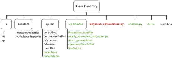 The additional updateGeo directory refers to the implementation of Steps 1 and 2 of the optimization framework (see Figure 3). This directory must contain all dictionary files related to updating the CAD file geometry <geometryFile>. FCStd, the file Parameters_inputFile, the modify_parameters_and_export.py code, and Allrun_generateMesh script. An additional directory named filesToJoin must also be present, containing the STL surface files for each group of geometry patches, which are automatically generated by the Python code during the optimization process.