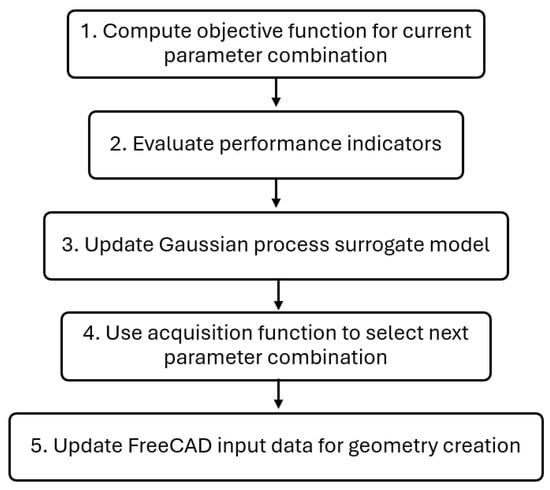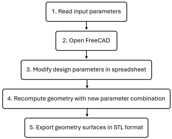 The geometry used in this optimization framework is generated by FreeCAD v1 [], an open-source 3D parametric modeling software with a built-in Python scripting environment, allowing for task automation. To leverage this feature and streamline the geometry creation process, a Python script was developed to update the geometry. The flowchart of the code structure is illustrated in Figure 5.