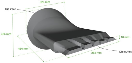 The profile extrusion of thermoplastic materials plays a crucial role in the manufacturing of various products with complex cross-sectional geometries, including window frames, automotive trims, and sealing systems [,]. The extrusion die, which shapes the molten polymer into the final profile geometry, is a key component of this process. Its design significantly influences the dimensional accuracy, appearance of the extrudate, production efficiency, and overall product quality [,,,].