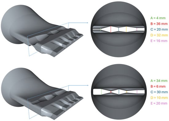 To validate the performance and applicability of the proposed optimization framework, two case studies were conducted using representative geometries of an extrusion die for a tire manufacturing. The first consists of a more complex geometry, as illustrated in Figure 10, with varying thicknesses at the die outlet section, while the second study consisted of a simpler geometry with constant thicknesses. To avoid extending the text, for interested reader, the second optimization case study is presented in the Supplementary Material. In both cases, the illustrated flow channel can be manufactured with a typical method employed for extrusion dies, wire EDM.