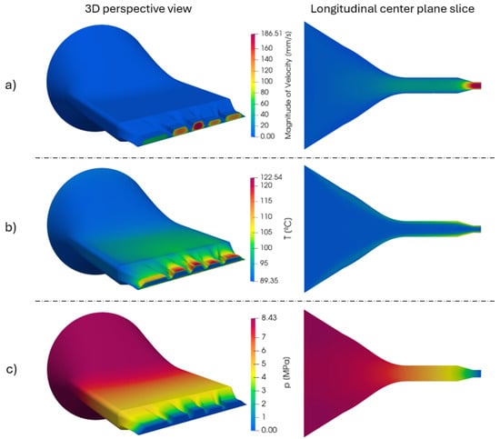 Simulation results for the initial die geometry, which served as the dataset for the starting point of the optimization process, are presented in Figure 13. The velocity field (Figure 13a) reveals a very unbalanced flow at the outlet, presenting higher velocities concentrated near the center of the outlet channel (ES6 and ES7) and significantly lower velocities near the lateral sections, especially at the left side (ES1 to ES3). The temperature field (Figure 13b) shows an increase in temperature towards the outlet, particularly concentrated in regions with higher velocity. This behavior is consistent with the viscous heating expected in regions of greater shear rate. Finally, the pressure field (Figure 13c) exhibits a gradual decrease along the flow direction, with a total pressure drop of approximately 8.4 MPa.