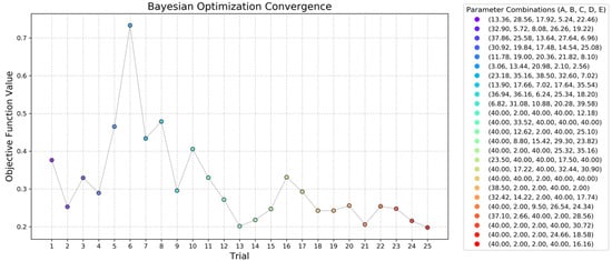 The acquisition function was defined as Expected Improvement (EI), which aimed to balance exploration and exploitation of the search space to identify the optimal parameter combinations within the 25 iterations. The search space (parameter range) was defined with a lower bound of 2 mm and an upper bound of 40 mm for all five parameters.