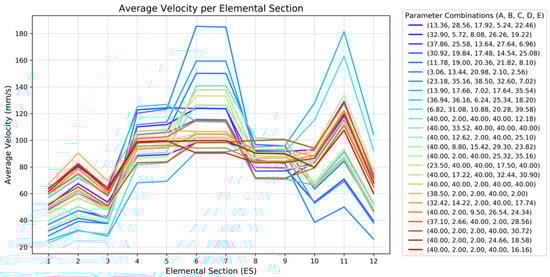 The evolution in velocity distribution at the outlet is shown in Figure 15, where the average velocity across the 12 Elemental Sections (ESs) is plotted for each simulated geometry.