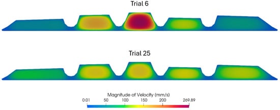 Die outlet velocity field comparison for Trial 6 (top) and Trial 25 (bottom) of the optimization loop.