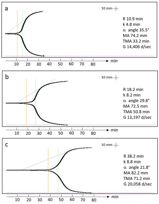TEG tracings from two 20-year-old females (a,b) and one 20-year-old male (c) showing the clot reaction time (orange line), the clot formation time (green line) and the α angle (blue line).