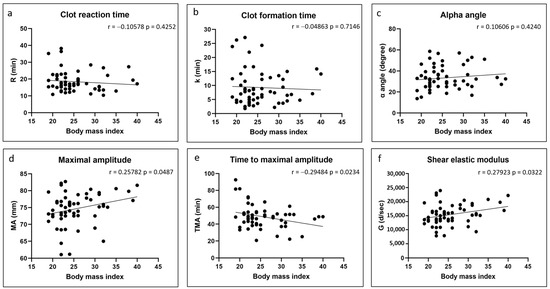 Linear regression plots showing Pearson correlation coefficients r and corresponding p values between TEG data and donor body mass index.