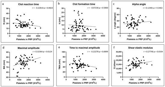 Linear regression plots showing Pearson correlation coefficients r and corresponding p values between TEG data and PRP platelet content.