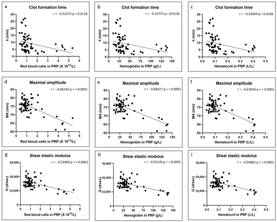 Linear regression plots showing Pearson correlation coefficients r and corresponding p values between TEG data and PRP red blood cell content (a,d,g), PRP hemoglobin content (b,e,h) and PRP hematocrit content (c,f,i).