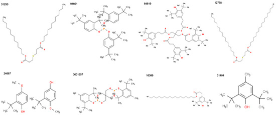 In the context of this study, MR could help understand how modifications in chemical structure (adding additives to the polymers) affect the overall characteristics of the material [80,81]. The highest MRs correspond to the antioxidants CID 64819 (pentaerythritol tetrakis(3-(3,5-di-tert-butyl-4-hydroxyphenyl)propionate), known as Irganox 1010); 12738 (octadecyl3-(3-octadecoxy-3-oxopropyl)sulfanylpropanoate, known as Hostanox SE 2); and 91601 (Tris(2,4-ditert-butylphenyl) phosphite, known as Irgafos 168). The lowest are associated with the UV stabilizer CID 70355 (1-Hydroxycyclohexylphenylketone) and the UV photoinitiator CID 4632 (2-hydroxy-4-methoxybenzophenone).