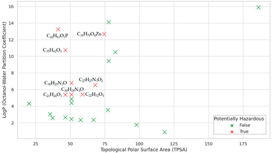 Combining the information drawn from TPSA and LogP analysis (Figure 5), we find that the molecules with LogP > 5 and TPSA < 75 Å2 (i.e., CIDs 11178, 15797, 16386, 24667, 77470, 91601, 112412, 4992761), flagged in red in Figure 5, are potentially hazardous because they are lipophilic and membrane-permeable, increasing the potential for bioaccumulation and systemic exposure.