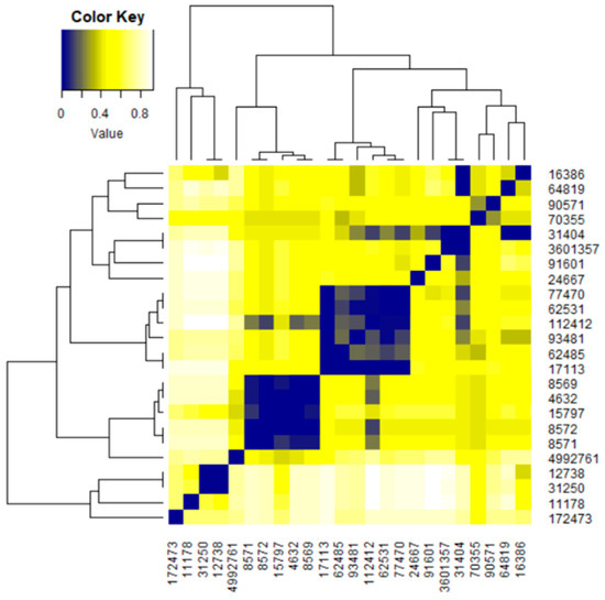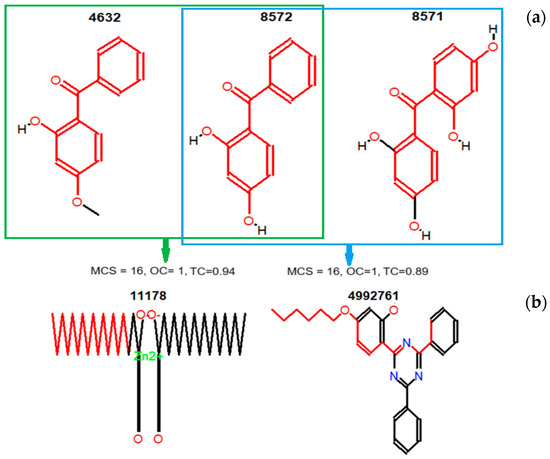 A deeper investigation of the molecules’ similarity was undertaken using the algorithm implemented in the fmcsR package [48], which provides the (flexible) maximum common substructure (FMCS) of pairwise compounds that contain mismatches between atoms and/or bonds. In this case, the Tanimoto coefficient was computed from graph-based MCS results, using Formula (3).