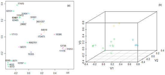 Figure 7a contains the plane representation of all clusters, and Figure 7b shows the spatial representation of the clusters with a minimum of two elements when the cutoff is 0.3. Figure 7b emphasizes a good separation of the clusters with two, four, and twelve elements. The compounds 11178, 3125, 12738, and 16386 are in the same group (represented in cyclamen in Figure 7a and blue in Figure 7b). The cluster with dimension 12 (the green dots in Figure 7a) is not homogenous. Two subgroups are distinguished, i.e., (4569, 8569, 8571, 8572, 15797) and (62485, 93481, 112412, 62351), suggesting a possible refinement.
