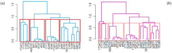 All measures, except Dunn, in Table 5b, indicated that the best choice is HC, so we went forward with this algorithm. To obtain the best performances in HC, the following four linkage methods were tested: ‘simple’, ‘average’, ‘complete’, and ‘Ward.D2’. The linkage method in HC was selected after observing the values of Cophc, which were 0.6924, 0.8515, 0.8637, and 0.8646, respectively. Since the highest value corresponded to the ‘Ward.D2,’ linkage, we used it in the study.