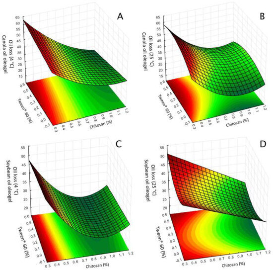 Response surface plot of the oil loss. Effect of the concentration of chitosan and Tween® 60 with vanillin concentration fixed at central point. (A) Chitosan-based oleogels made with canola oil and stored at 4 °C for 24 h; (B) Chitosan-based oleogels made with canola oil and stored at 25 °C for 24 h; (C) Chitosan-based oleogels made with soybean oil and stored at 4 °C for 24 h; (D) Chitosan-based oleogel made with soybean oil and stored at 25 °C for 24 h.