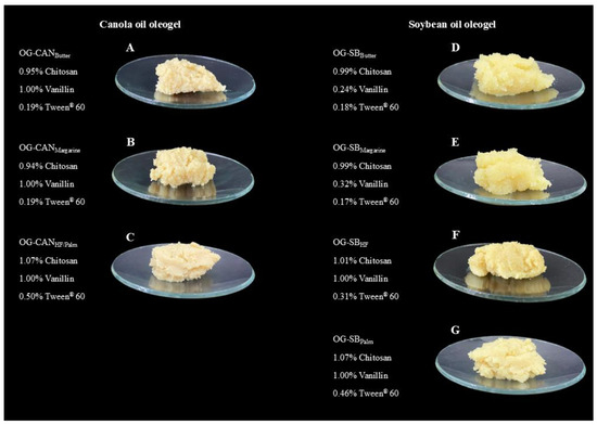 Visual appearance of optimized chitosan-based oleogels using canola oil (A–C) and soybean oil (D–G). (A) Canola oil oleogel mimetic of butter (OG-CANButter); (B) canola oil oleogel mimetic of margarine (OG-CANMargarine; (C) canola oil oleogel mimetic of hydrogenated fat and palm fat (OG-CANHF/Palm); (D) soybean oil oleogel mimetic of butter (OG-SBButter); (E) soybean oil oleogel mimetic of margarine (OG-SBMargarine); (F) soybean oil oleogel mimetic of hydrogenated fat (OG-SBHF); (G) soybean oil oleogel mimetic of palm fat (OG-SBPalm).