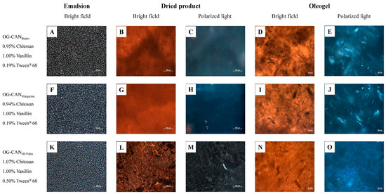 Microstructure of the optimized chitosan-based oleogels made with canola oil under bright-field and polarized light at 25 °C. Micrographs of emulsions (A,F,K), dried products ((B,G,L): bright field; (C,H,M): polarized light), and final oleogels ((D,I,N): bright field; (E,J,O): polarized light).