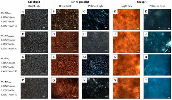 Microstructure of the optimized chitosan-based oleogels made with soybean oil under bright-field and polarized light at 25 °C. Micrographs of emulsions (A,F,K,P), dried products ((B,G,L,Q): bright field; (C,H,M,R): polarized light), and final oleogels ((D,I,N,S): bright field; (E,J,O,T): polarized light).