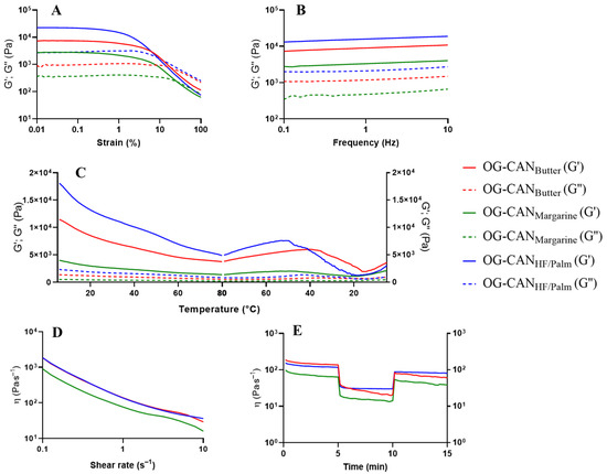 Rheological analysis of optimized formulation of canola oil oleogels: OG-CANMargarine: 0.94% chitosan, 1.0% vanillin, 0.19% Tween® 60 (green line); OG-CANButter: 0.95% chitosan, 1.0% vanillin, 0.19% Tween® 60 (red line); OG-CANHF/Palm: 1.07% chitosan, 1.0% vanillin; 0.50% Tween® 60 (blue line). Elastic modulus (G′) is represented by the full lines and viscous modulus (G″) by the dotted lines. (A) Stress sweep test; (B) Frequency sweep test; (C) Oscillatory temperature test; (D) Shear-thinning behavior test; (E) Oscillatory shear behavior (recovery test).
