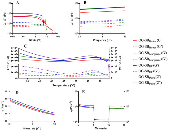 Rheological analysis of optimized formulation of soybean oil oleogels: OG-SBButter: 0.99% chitosan, 0.24% vanillin, 0.18% Tween® 60 (red line); OG-SBMargarine: 0.99% chitosan, 0.32% vanillin, 0.18% Tween® 60 (green line); OG-SBHF: 1.01% chitosan, 1.0% vanillin, 0.31% Tween® 60 (blue line); OG-SBPalm: 1.07% chitosan, 1.0% vanillin, 0.46% Tween® 60 (purple line). Elastic modulus (G′) is represented by the solid lines and viscous modulus (G″) by the dotted lines. (A) Stress sweep test; (B) Frequency sweep test; (C) Oscillatory temperature test; (D) Shear-thinning behavior test; (E) Oscillatory shear behavior (recovery test).