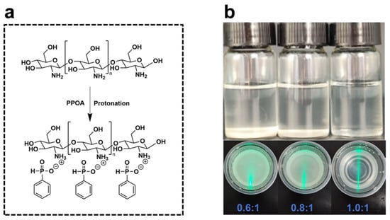 The phenylphosphinic acid-protonated chitosan derivative (CS-PPOA) was synthesized through the protonation reaction between chitosan amino groups and phosphinic acid moieties (Figure 1). Figure 1a shows the synthesis route of CS-PPOA. The experimental procedure was conducted as follows: Chitosan and phenylphosphonic acid (with a molar ratio of amino groups to phenylphosphinic acid of 1:1) were mixed and co-dissolved in deionized water. The mixture was subjected to mechanical stirring (800 r/min) at room temperature for 3 h, during which chitosan gradually dissolved to yield a homogeneous solution, designated as CS-PPOA. For comparative studies, acetic acid-protonated chitosan derivative (denoted as CS-HAc) was prepared by dissolving chitosan in an aqueous solution containing acetic acid, maintaining identical stirring and temperature conditions.
