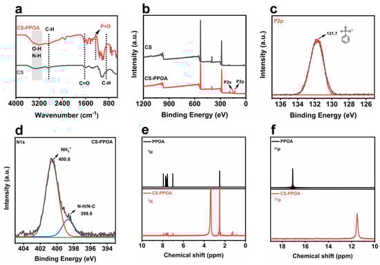 FT-IR spectra of CS-PPOA and CS-HAc (a), XPS survey spectra of CS and CS-PPOA (b), high-resolution P2p spectra of CS-PPOA (c), high-resolution N1s spectra of CS-PPOA (d), 1H NMR and 31P NMR spectra of PPOA and CS-PPOA (e,f).