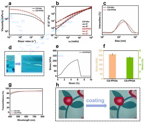 Viscosity profiles of CS-HAc versus CS-PPOA solution (a). Frequency-dependent viscoelastic behavior (b). Particle size distribution curves of CS-HAc versus CS-PPOA solution (c). Flexural deformation demonstration of CS-PPOA film (d). The tensile stress–strain curves and bar charts of CS-PPOA film (e,f). Optical transmittance of CS-HAc and CS-PPOA films (g). Before-and-after comparison images of the printed fabric treated with CS-PPOA coating (h).
