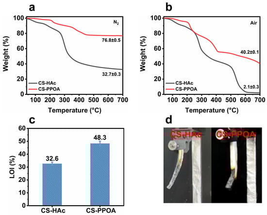TGA curves of CS-HAc and CS-PPOA under nitrogen and air atmospheres (a,b). The LOI of CS-HAc and CS-PPOA splines (c). Digital photographs capturing the vertical burning behavior of CS-HAc and CS-PPOA spline materials (d).