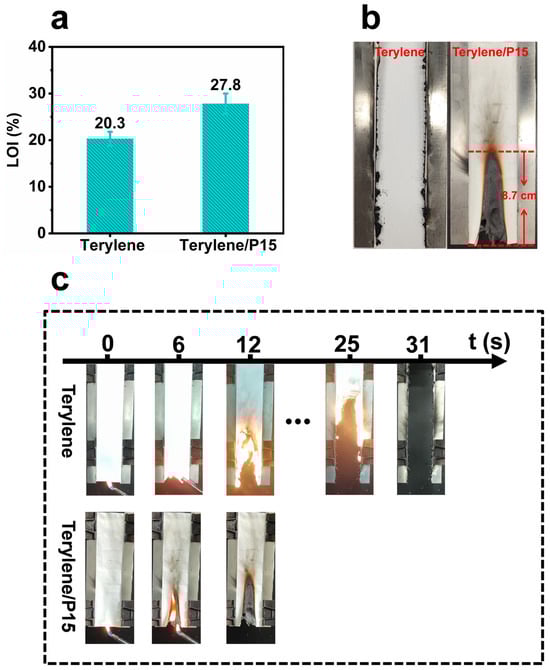 The LOI of comparison between pristine Terylene and Terylene/P15 fabrics (a). Post-combustion morphology of the specimens after the VFT test (b). Diagram of the VFT process for Terylene and Terylene/P15 fabrics (c).
