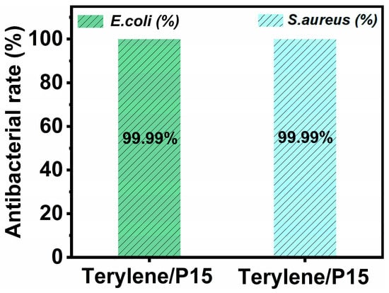 The antibacterial performance of Terylene/P15 fabrics was systematically evaluated against representative Gram-negative (Escherichia coli) and Gram-positive (Staphylococcus aureus) strains, as shown in Figure 6. From the literature, it is evident that polyester fabric exhibits virtually no inhibitory effect on Escherichia coli and Staphylococcus aureus, with an antibacterial efficacy of 0% for both bacteria [39]. The Terylene/P15 exhibits exceptional antibacterial efficacy against both Escherichia coli and Staphylococcus aureus, achieving a bacterial inhibition rate of 99.99%. This near-complete eradication of both Gram-negative and Gram-positive pathogens highlights the broad-spectrum antimicrobial potential of CS-PPOA. The superior performance of CS-PPOA is attributed to its dual-mode synergistic bactericidal mechanism: Initially, the protonated amino groups (-NH3+) in the CS-PPOA form electrostatic interactions with negatively charged microbial cell membranes, compromising membrane integrity through structural destabilization. This primary damage enables subsequent penetration of bactericidal components into the cytoplasm, where they disrupt critical cellular processes including protein synthesis and metabolic regulation [40]. The combined effects of membrane permeabilization and intracellular interference synergistically induce rapid bacterial inactivation.