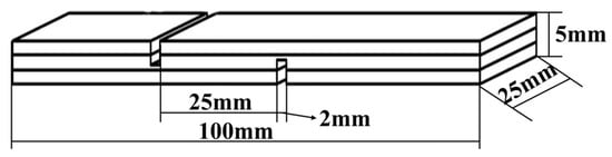 Three-layer plywood was prepared using poplar veneers with dimensions of 180 mm × 110 mm × 2 mm for each layer. The adhesive was applied on the surface of the specimen with a glue amount of 300 g/m2, and the pressing time was 10–15 min. After this, the plywood samples were pressed using a press machine that was purchased from Kunshan Rugong Precision Instrument Co., Ltd., Kunshan, China, at different hot-pressing temperatures: 160 °C, 170 °C, 180 °C, 190 °C, and 200 °C, with a unit pressure of 1 MPa, and a pressing time of 5 min. The obtained plywood samples were allowed to acclimate at room temperature for at least 24 h. Following this, the plywood samples were cut into standard test specimens, as shown in Figure 1, according to the testing requirements specified in the national standard GB/T 17657-2022 [] for plywood bonding strength. According to the national standard GB/T 17657-2022, the testing for dry shear strength, 24 h cold water soaking strength (20 ± 3 °C), and 3 h hot water soaking strength (63 ± 3 °C) was conducted to assess the plywood’s resistance to boiling water. An additional 3 h of testing the soaking strength was performed. The values for each set of bonding strength evaluation were the averages of 6 measurements.