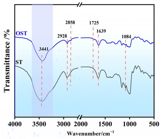 FT-IR spectra of starch (ST) and OST.
