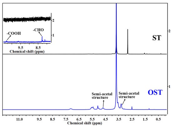 It was thus suggested that in this equilibrium system, there were aldehyde hydrates and hemiacetal groups, while free aldehydes were absent []. Furthermore, the high sensitivity of 1H-NMR spectroscopy enabled the detection of a relatively weak signal at 10.50 ppm, which presents evidence for carboxyl groups (COOH) formation. This also indicates that some hydroxyl groups in the ST structure encountered excessive oxidation to form carboxyl groups.