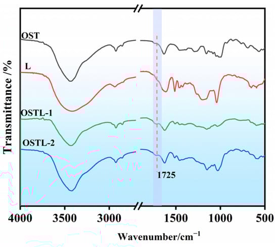 FT-IR spectra of OST, lignin (L), OSTL-1 (uncured resin adhesive), and OSTL-2 (cured resin adhesive).