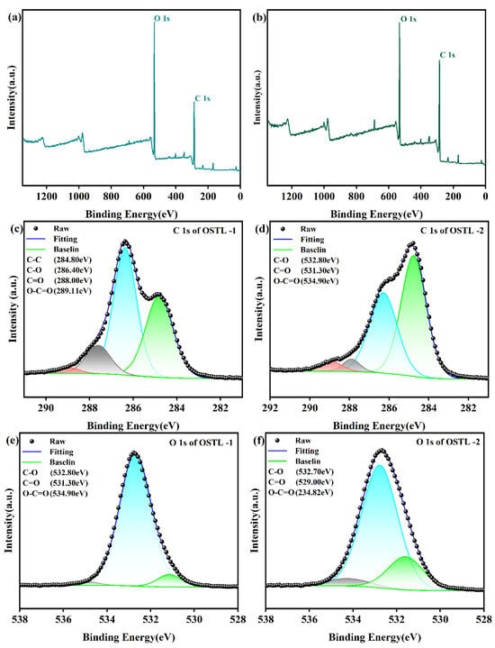 XPS spectra of OSTL-1 and OSTL-2. (a) XPS full measurement spectra of OSTL-1, (b) XPS full measurement spectra of OSTL-2, (c) high-resolution C 1s spectrum of OSTL-1, (d) high-resolution C 1s spectrum of OSTL-2, (e) high-resolution O 1s spectrum of OSTL-1, and (f) high-resolution O 1s spectrum of OSTL-2.