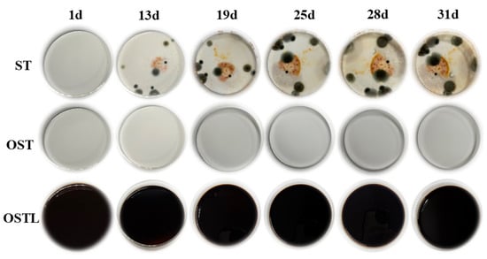 Starch, a polysaccharide composed of anhydroglucose units, ranks as the second most abundant carbohydrate in plants. It serves as a crucial carbon source for microbial growth and reproduction. However, starch is highly susceptible to fungal infection [,], which limits its industrial applications significantly. As can be shown in Figure 8, the antimicrobial properties of various liquid samples were examined over one month, under conditions of room temperature and 90% relative humidity. It is noteworthy that mold growth began to appear around the 13th day in starch-based materials, and as time progressed, the mold spread further, gradually covering the entire base liquid of the culture dish. In contrast, OST and the samples cross-linked with L did not show any mold erosion, indicating that OST indeed acquired certain antifungal properties [,]. Meanwhile, lignin possesses natural antimicrobial properties [], enabling the prepared OSTL adhesive to largely resist fungal corrosion.