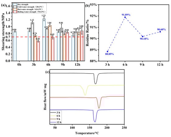 (a) Shear strength of plywood prepared using OSTL adhesive prepared under different oxidation times of OST as a precursor. (b) Hydrolysis residual rate of OSTL adhesive under different oxidation times of OST as a precursor. (c) DSC traces of OSTL adhesive prepared under different oxidation times of OST as a precursor.