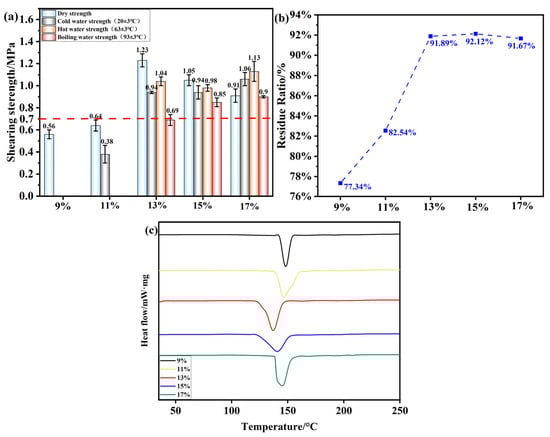 (a) Shear strength of plywood prepared using OSTL adhesives formulated with OST prepared using different oxidant additions. (b) Hydrolysis residual rate of OSTL adhesives formulated with OST prepared with different oxidant additions. (c) DSC curve of OSTL adhesives formulated with OST prepared using different oxidant additions.